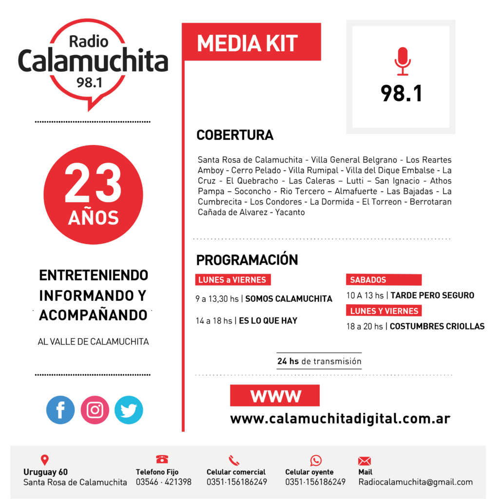 RADIO CALAMUCHITA es una F.M. autorizada por el AFSCA, transmite desde la ciudad de Santa Rosa de Calamuchita hacia todo el Valle de Calamuchita, Rio 3° arriba y el Valle de Paravachasca, (más de 60 kmts. a la redonda). Variada programación durante las 24hs del día, los 365 días del año a través del dial: 98.1. Trabajamos dia a dia para que Nuestro medio sea de gran Importancia para el crecimiento de la región.